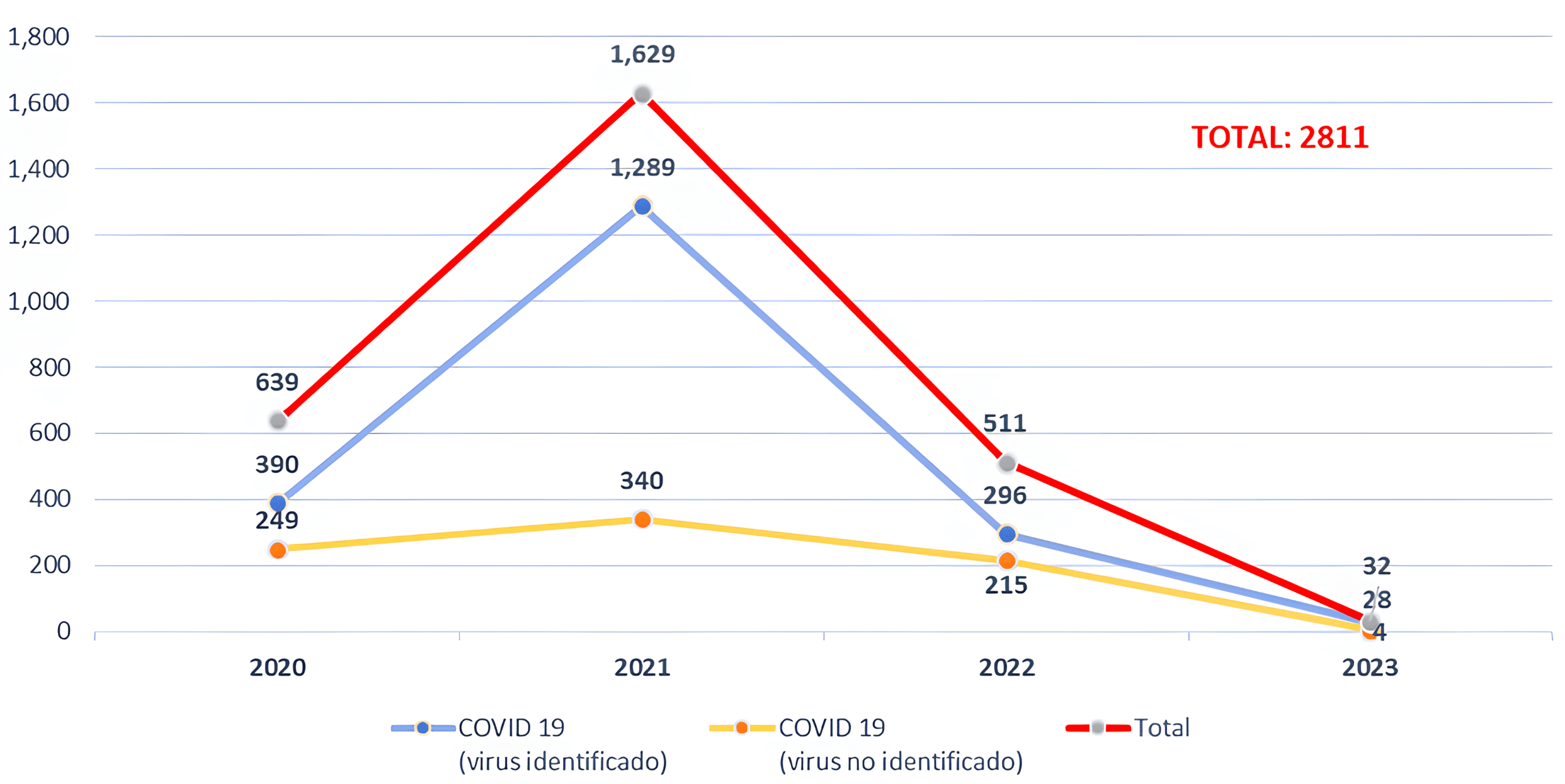 De acuerdo con el reporte de la Oficina General de Tecnologías de la Información del Ministerio de Salud, entre 2020 y 2023 se registraron un total de 2,811 defunciones por COVID-19 en personas con discapacidad. El año 2021 concentró el mayor número de fallecimientos, con 1,629 casos, lo que representa aproximadamente el 58% del total acumulado en ese periodo.
