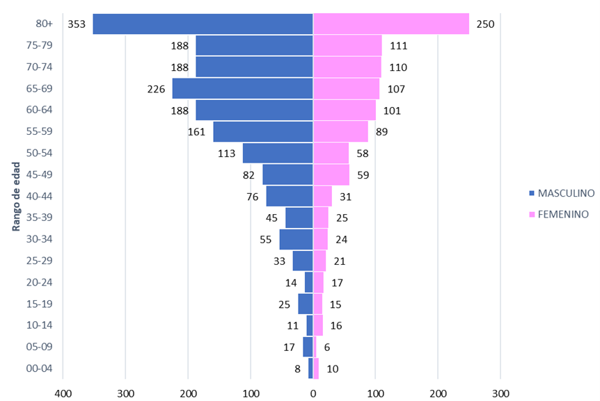 Pirámide poblacional de las defunciones por COVID-19 en personas con discapacidad, 2020 – 2023